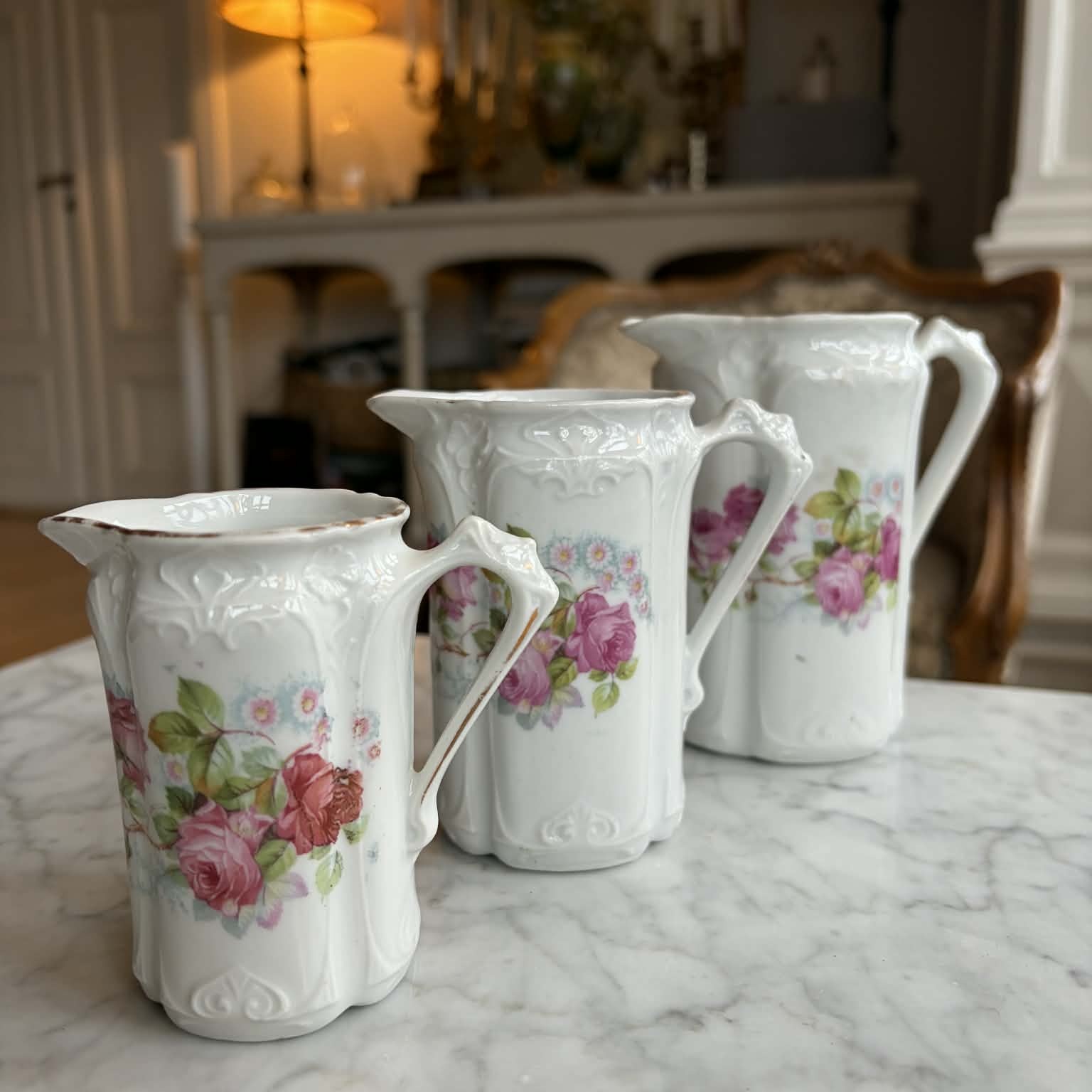 Franska vintage mjölk-/gräddkannor i porslin med rosdekor120,00 kr – 175,00 krPrisintervall: 120,00 kr till 175,00 kr -