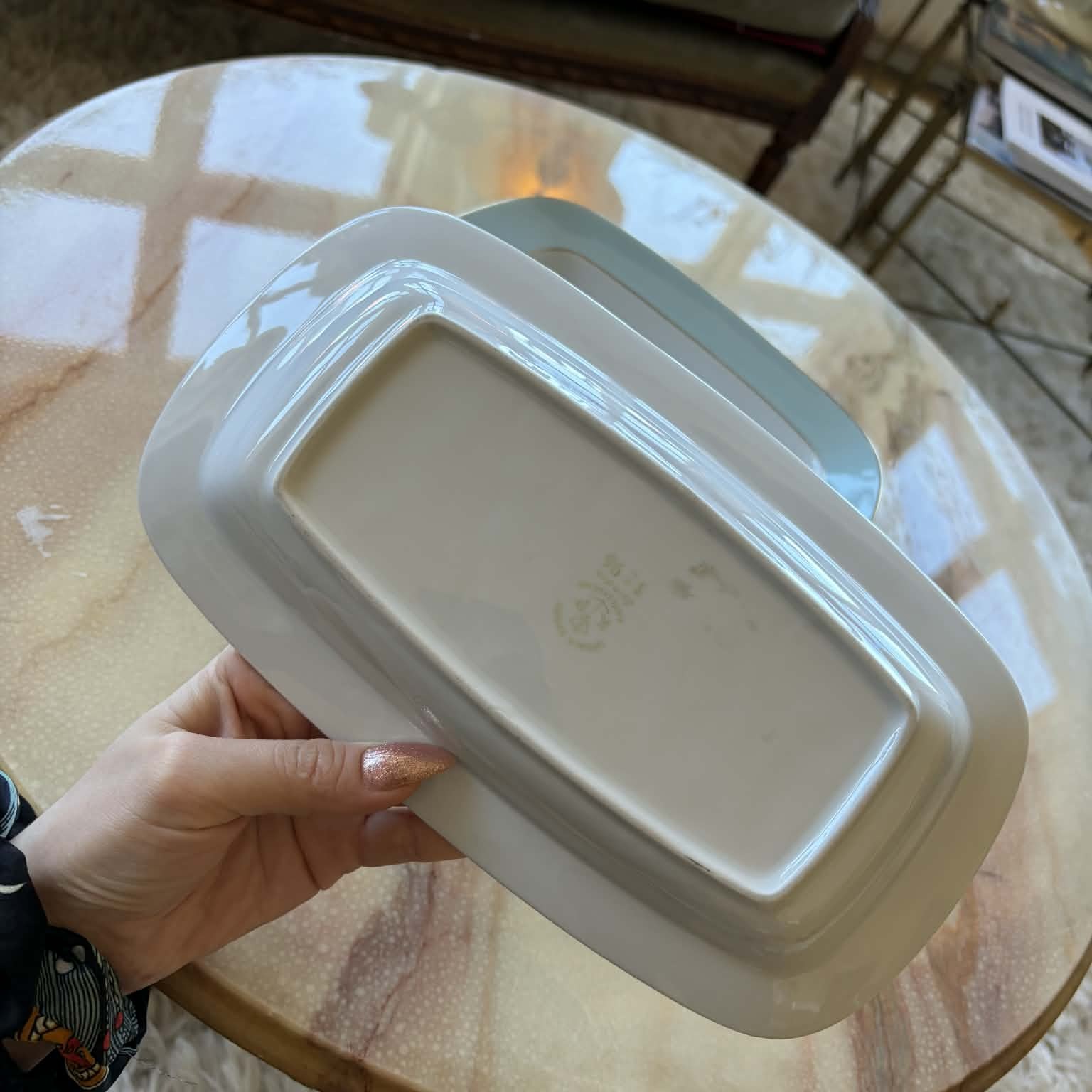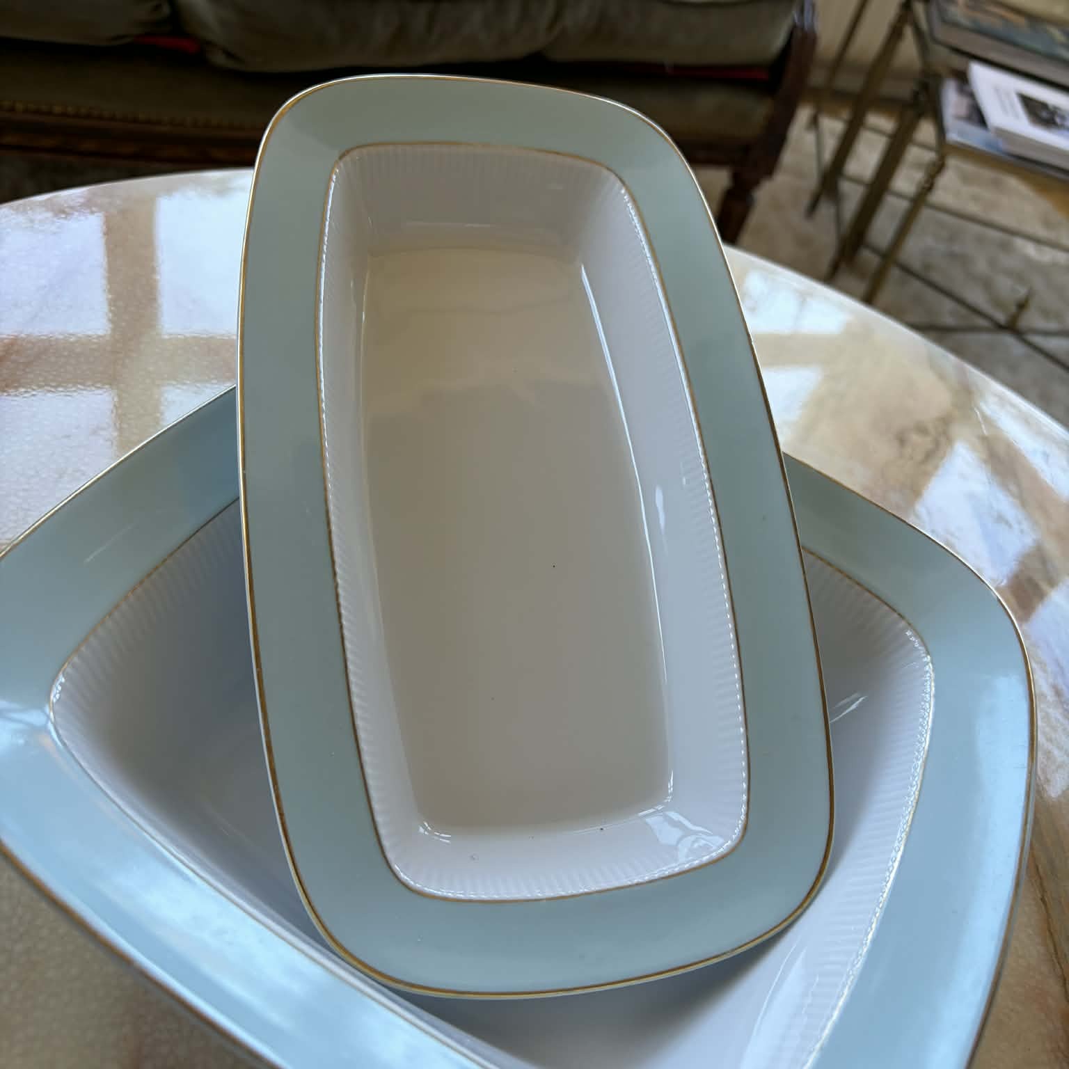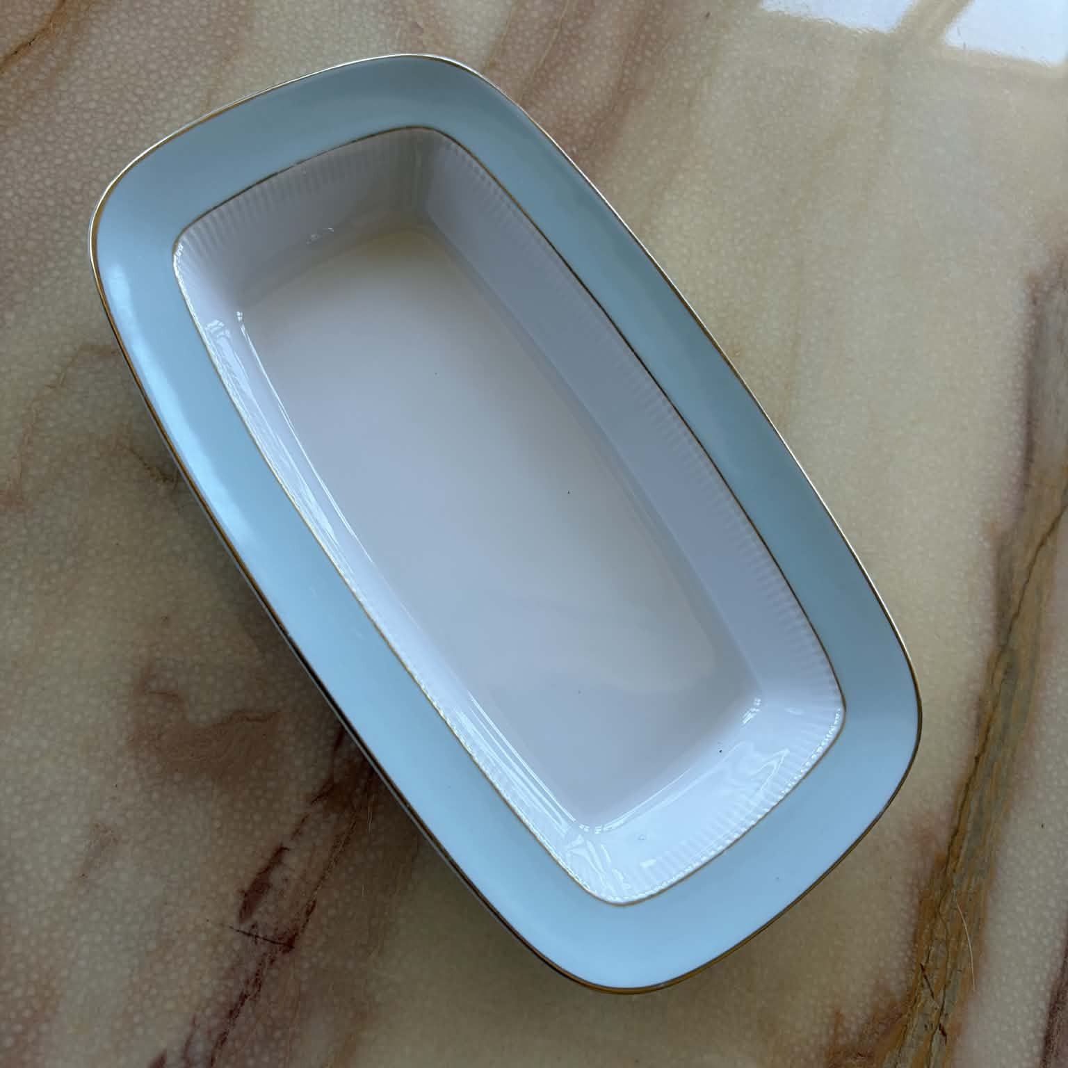 Avlång serveringsskål i porslin med guldkant