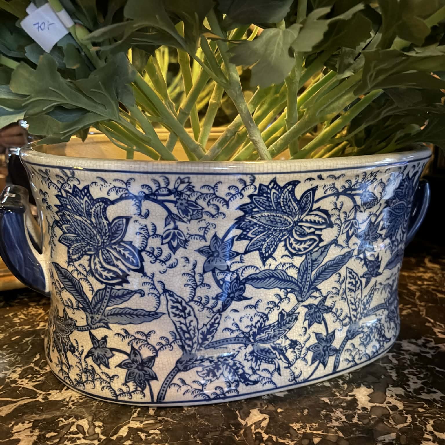Dekorativ oval kruka i blåvitt porslin