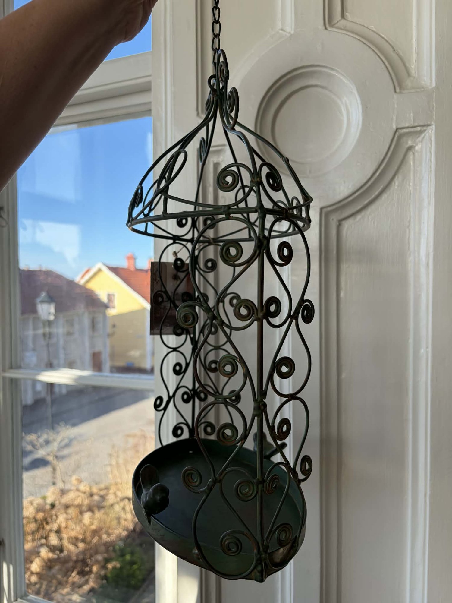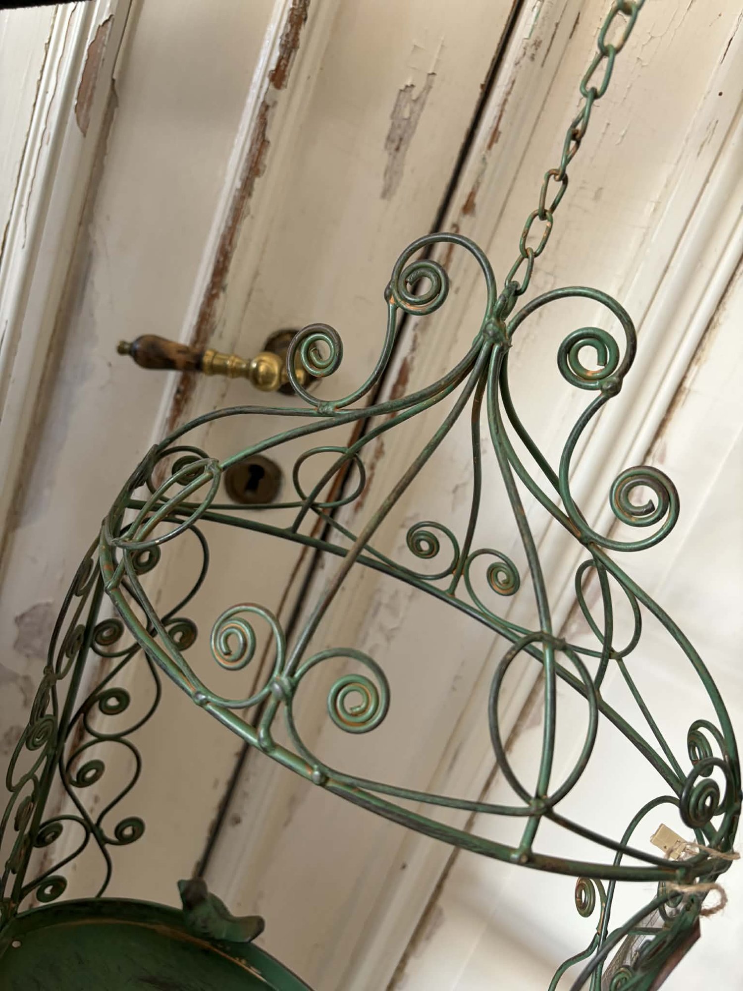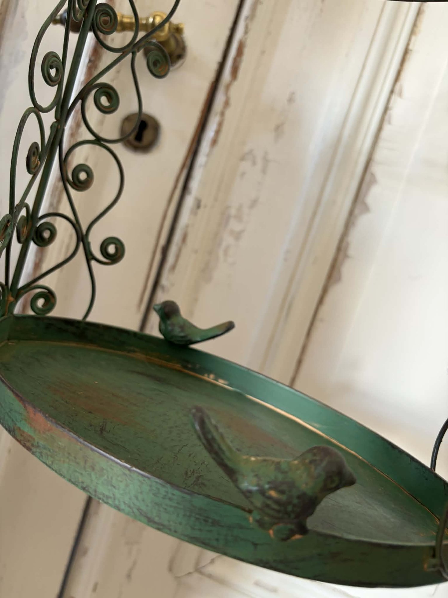 En vacker hängande dekorationskorg i smide med romantiska, snirkliga detaljer och små fågelfigurer som ger ett charmigt och unikt uttryck. Den gröna patinan ger ett stilrent vintageutseende som passar perfekt i både lantliga och klassiska miljöer.