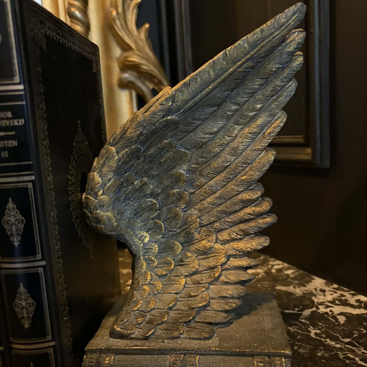 Dekorativt och stilfullt bokstöd i form av en vinge med vackert arbetad fjäderstruktur och elegant antikfärgad finish. Detta bokstöd säljs separat/styckvis och är i nytt skick.
