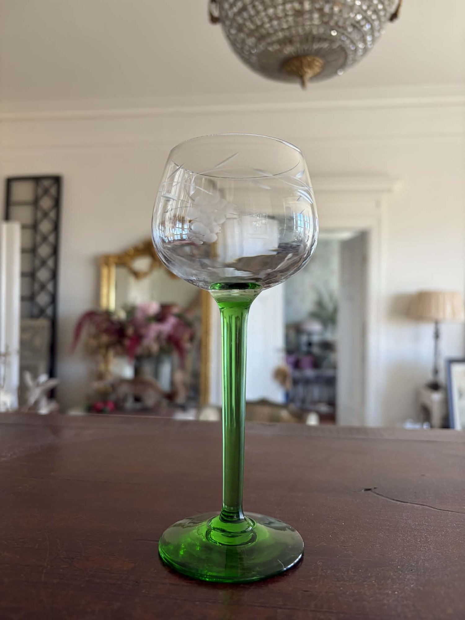 Elegant set med sex handgraverade vinglas, där varje glas pryds av ett vackert bladmönster och klasar i frostgravyr. De smäckra gröna stammarna ger en härlig retrokaraktär som för tankarna till 1950–60-talets skandinaviska design. Glasen passar lika bra till vin som till festliga drinkar, och blir en vacker detalj på dukningen – speciellt när ljuset fångar den gröna glansen i foten. Perfekt för dig som uppskattar hantverk, vintage och tidlös formgivning.