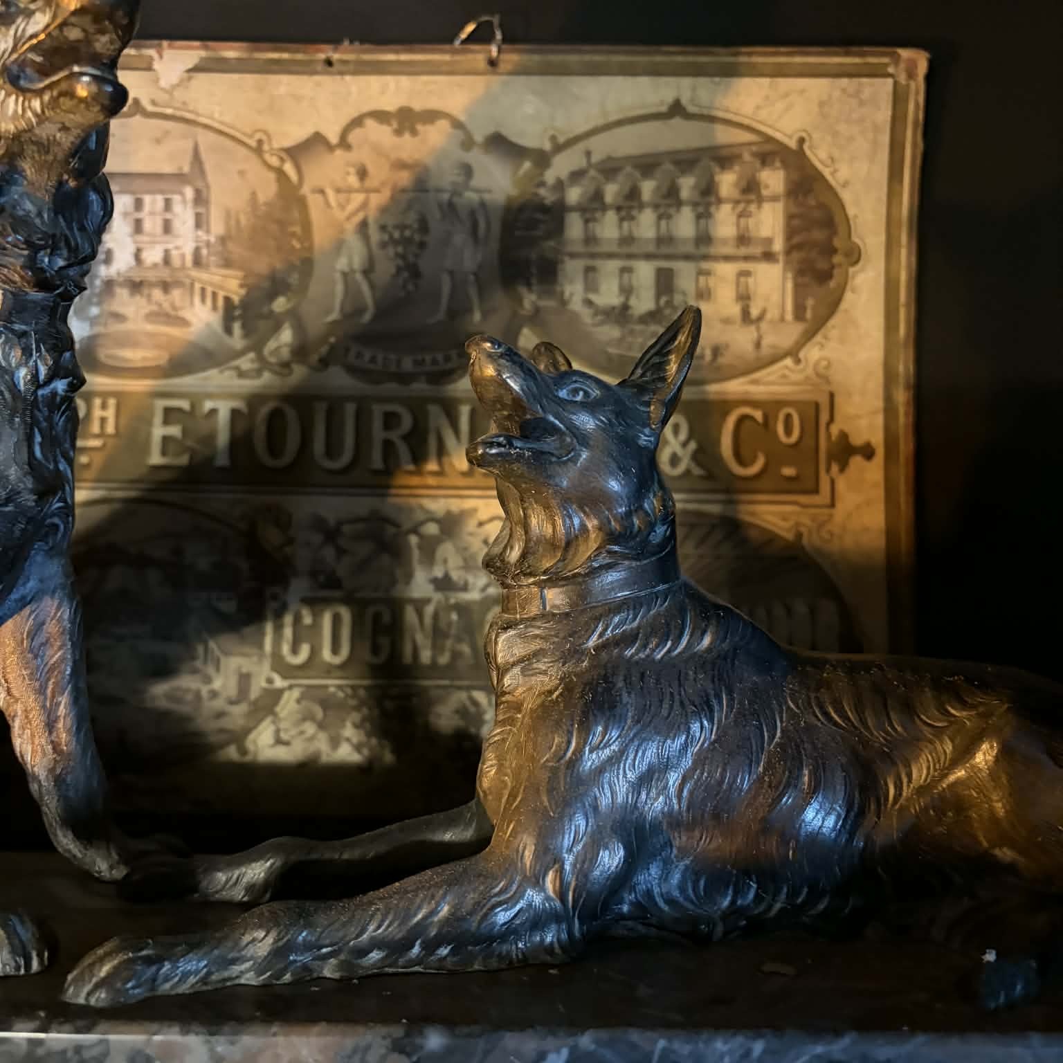 Ett mycket dekorativt och uttrycksfullt par schäferfigurer i klassisk stil, inköpta i Frankrike. Figurerna föreställer två vackert modellerade hundar – en sittande och en liggande – med fina detaljer i päls, ansikte och halsband som ger dem ett levande och elegant uttryck.