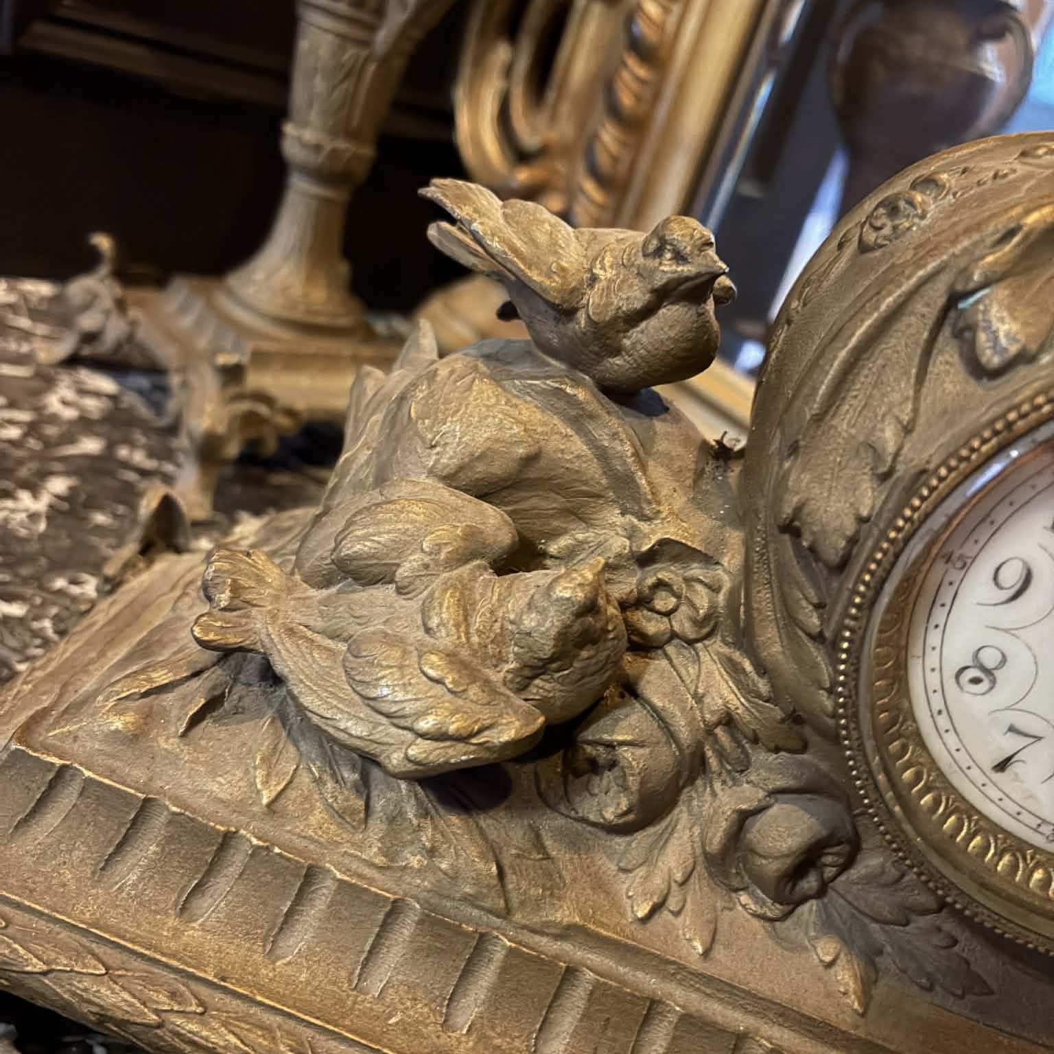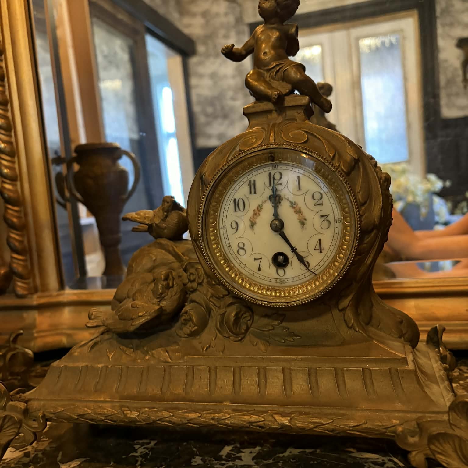 Vacker och mycket dekorativ fransk bordsklocka i antik stil, med rikt utsmyckad form och romantiska detaljer. Klockan har en elegant guldfärgad/bronsfärgad finish och är dekorerad med putto/änglabarn, fåglar och blomsterornament, vilket ger ett klassiskt och mycket charmigt uttryck med tydlig fransk känsla.
