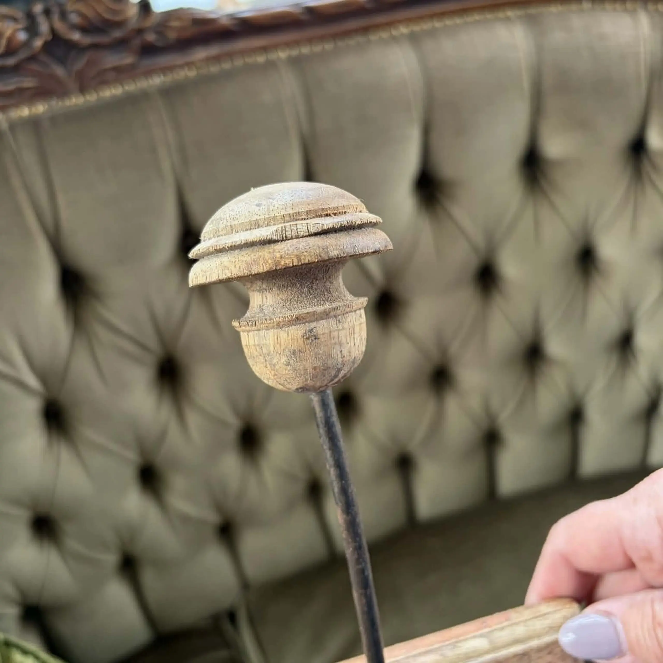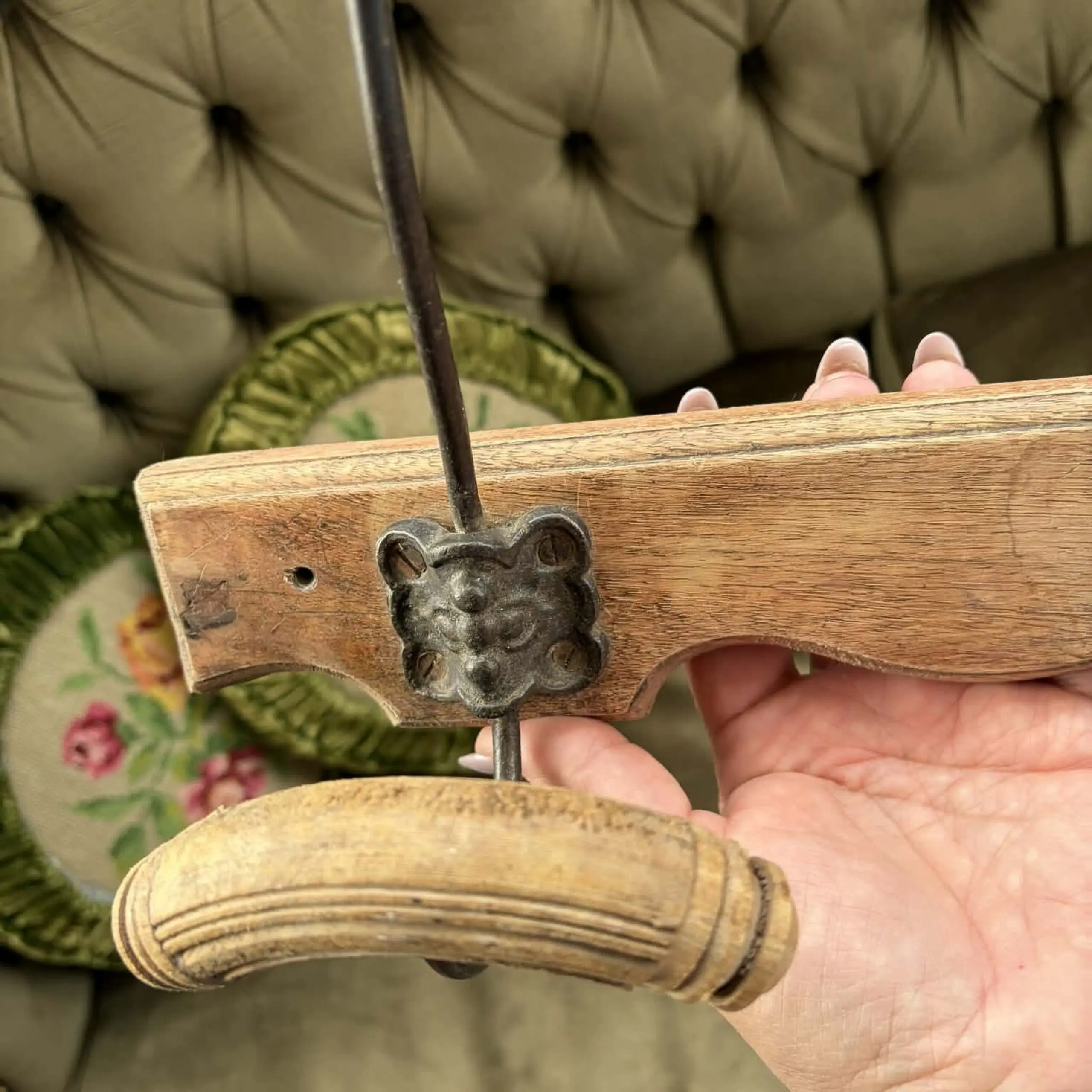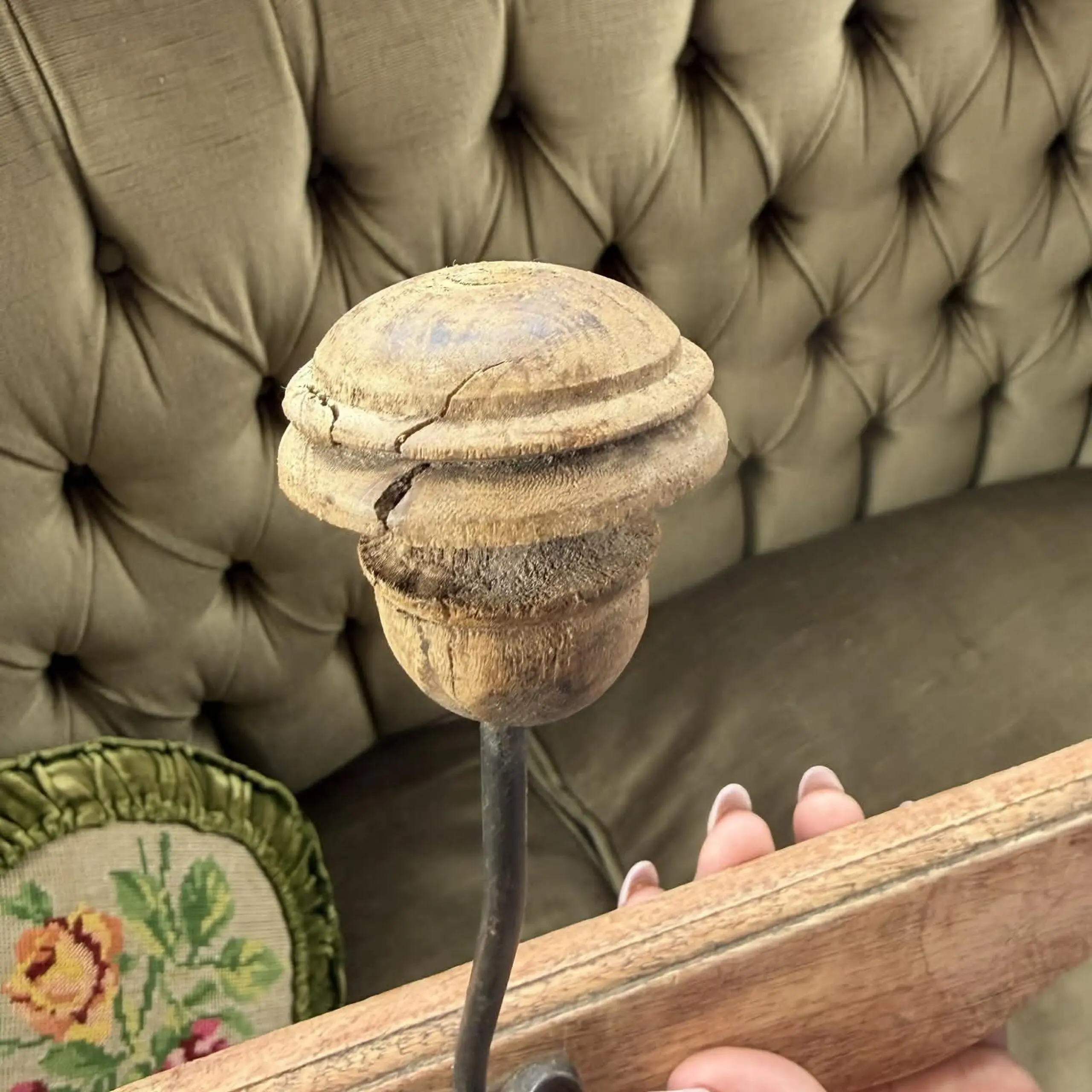 Charmig fransk antik väggkrok i trä och metall med vackert arbetad form och tidstypiska detaljer. Kombinationen av det åldrade träet, den mörka metallen och den svarvade trädetaljen ger ett genuint uttryck med tydlig känsla av äldre fransk lantstil.