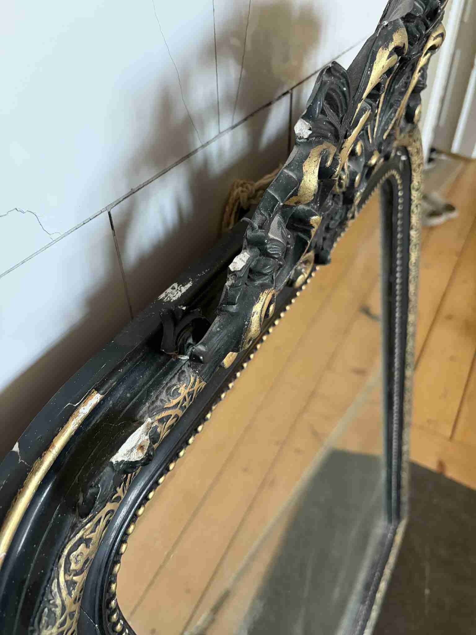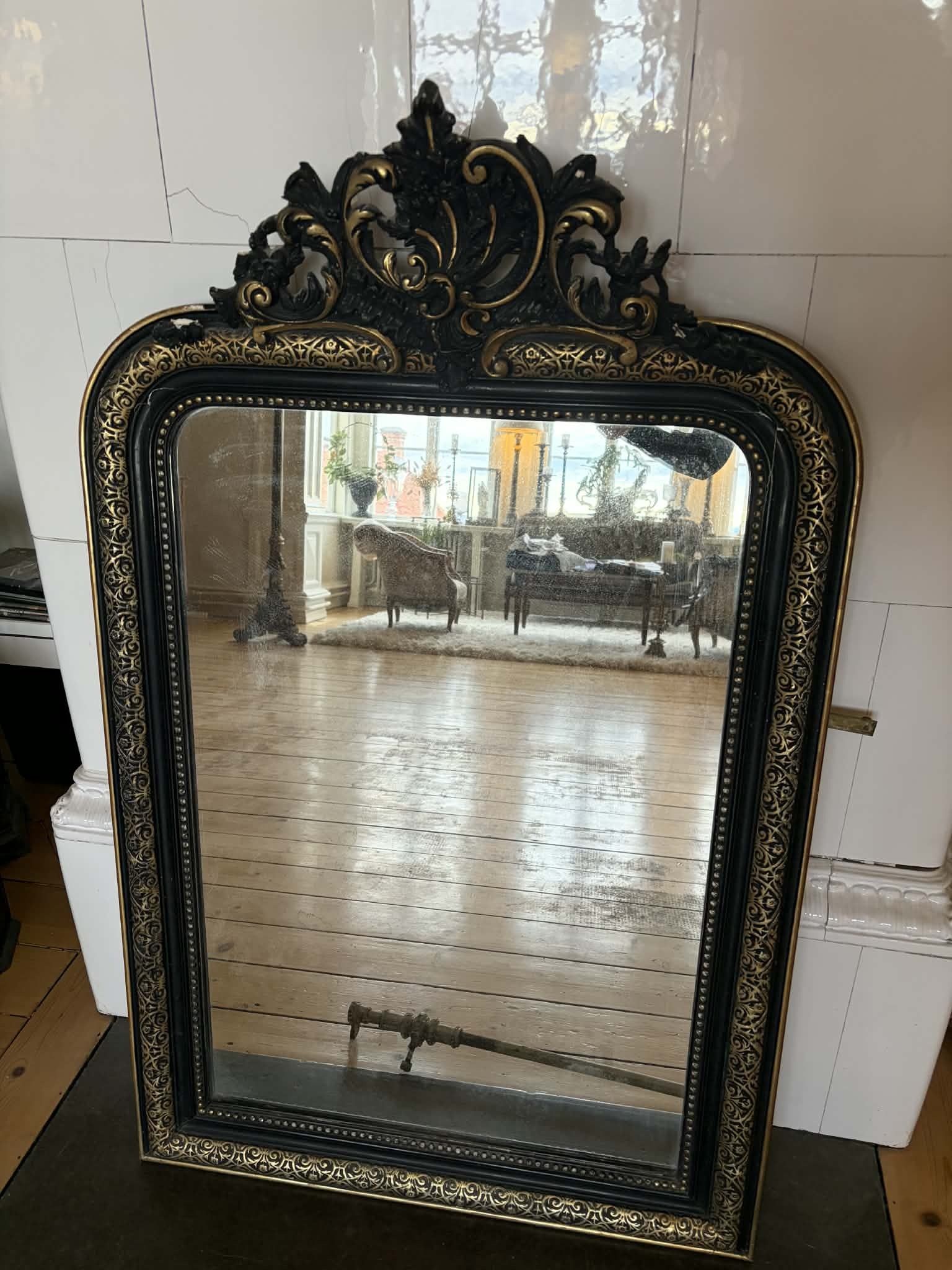 Fransk dekorativ spegel i svart & guld – antik stil med ornament