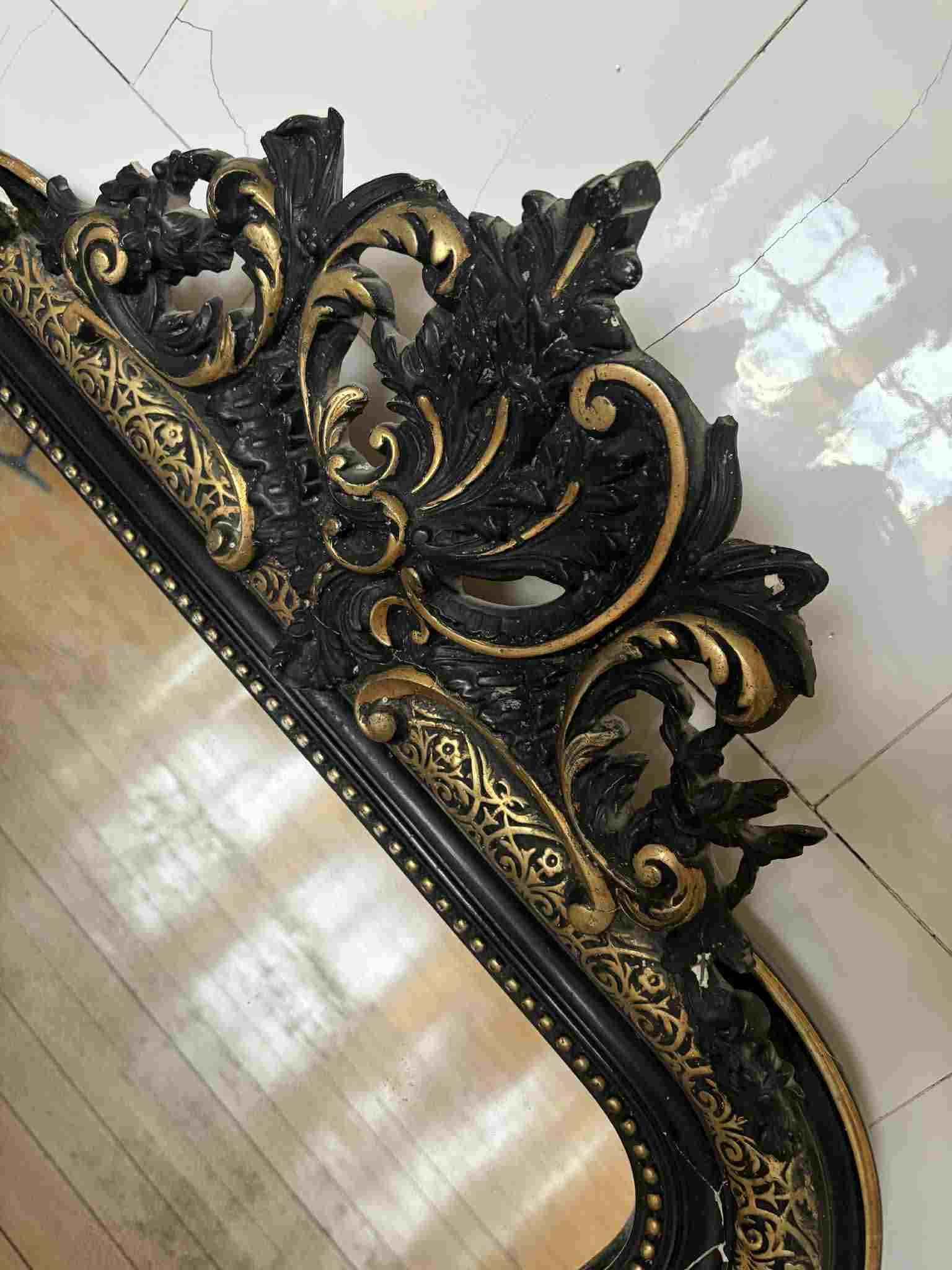 Vacker och mycket dekorativ väggspegel i svart och guld, köpt i Frankrike, med rikt ornamenterad överdel och elegant klassisk form. Spegeln har ett uttrycksfullt och exklusivt utseende med svart ram, gulddetaljer och dekorativ krönformad topp, vilket ger en tydlig känsla av fransk antik stil / barockinspirerad dekor.
