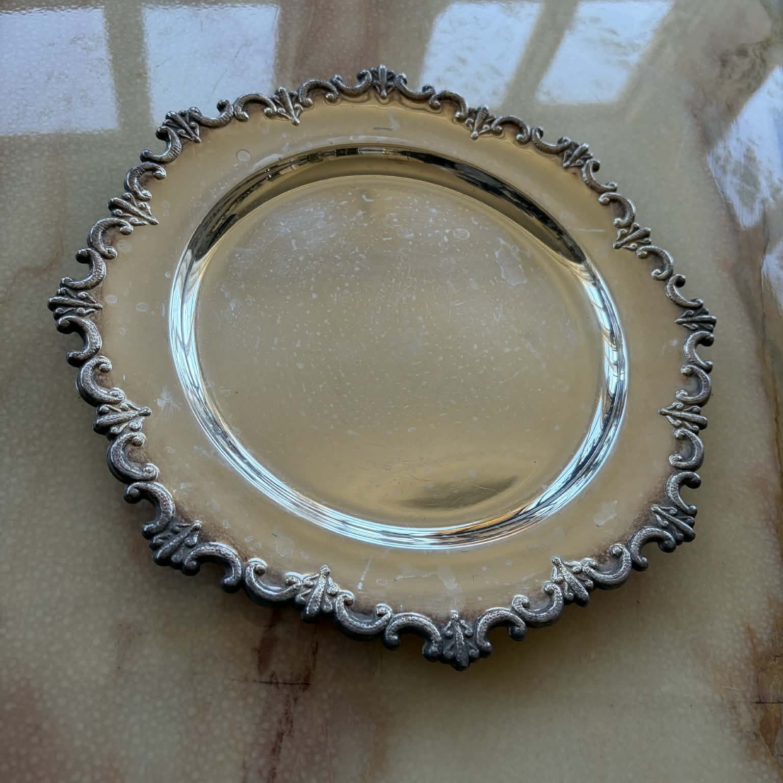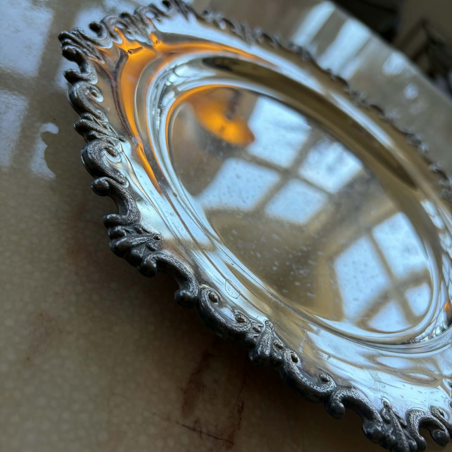 Den dekorativa kanten ger fatet karaktär utan att ta över, och den enkla speglande mitten skapar en fin balans. Ett charmigt äldre föremål med tydlig fransk känsla.