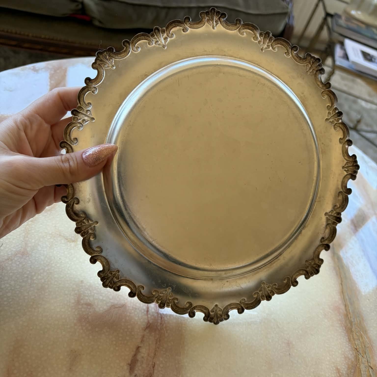 Äldre franskt fat i metall med vackert arbetad, sirlig kant i klassisk fransk stil. Ett elegant mindre fat med mjukt rund form och fint uttryck, passar lika väl till servering som som inslag i dukning eller på ett sideboard.