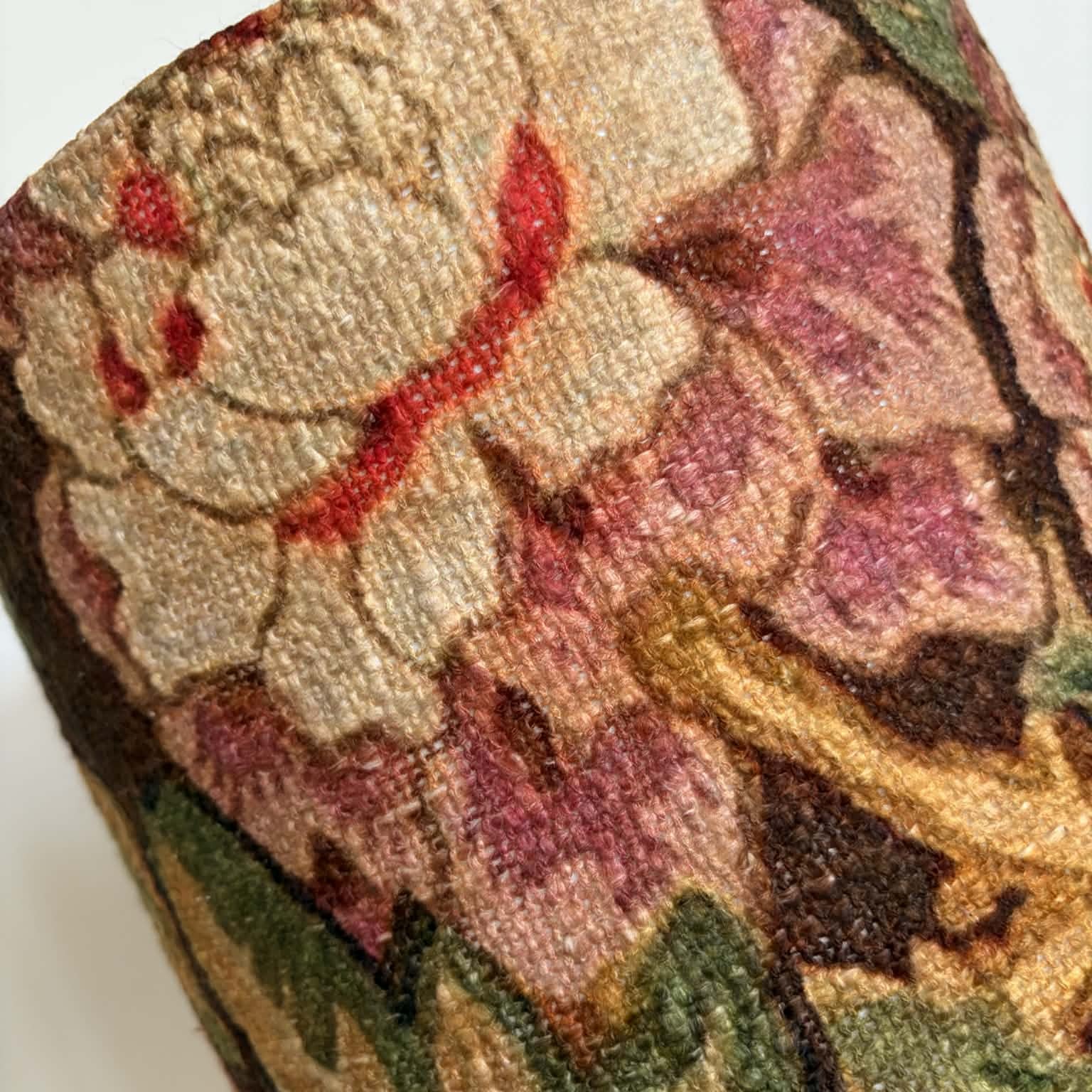 Den vävda strukturen och det blomstrande mönstret ger skärmen en exklusiv och tidlös karaktär som passar lika fint i äldre miljöer som i mer personliga och eklektiska hem.