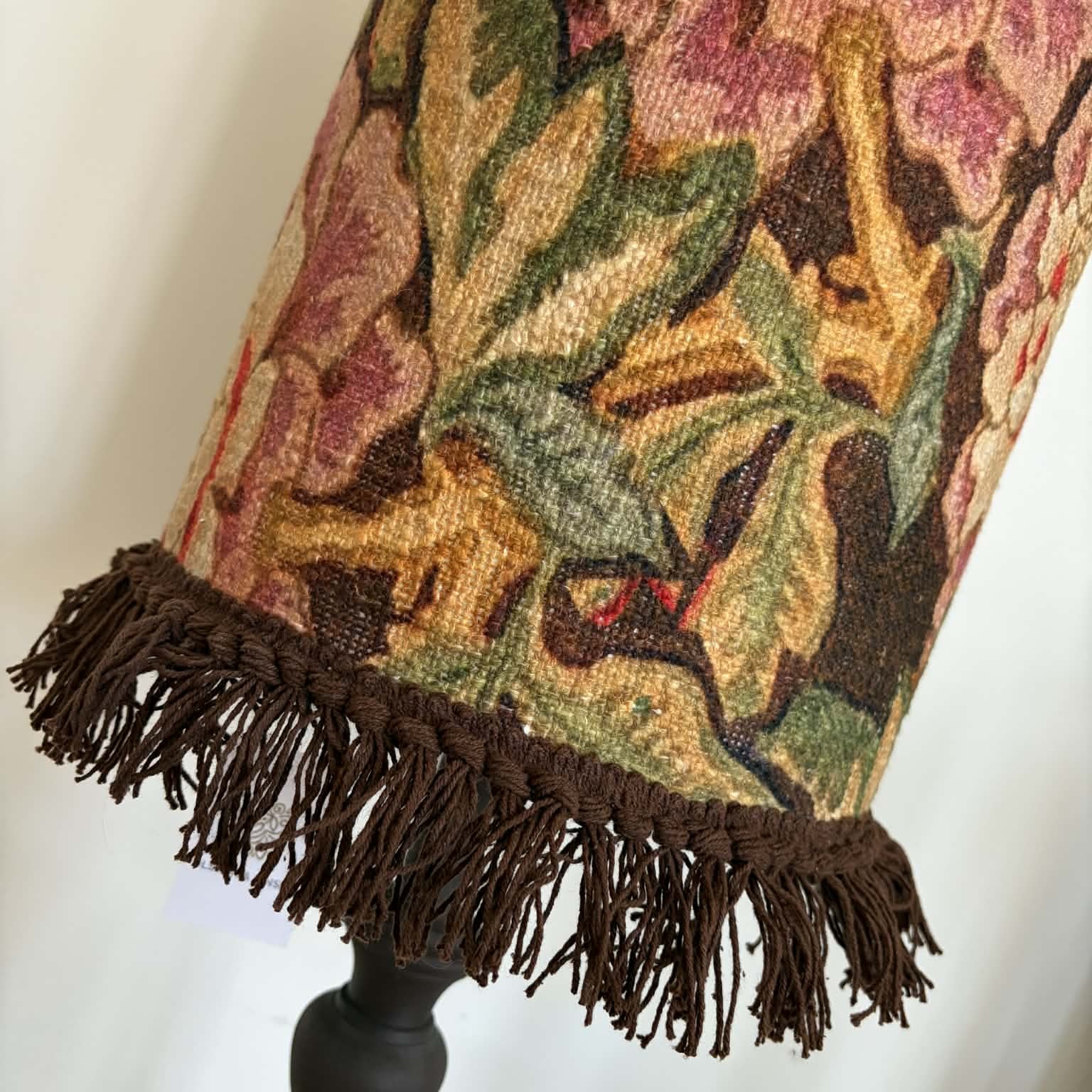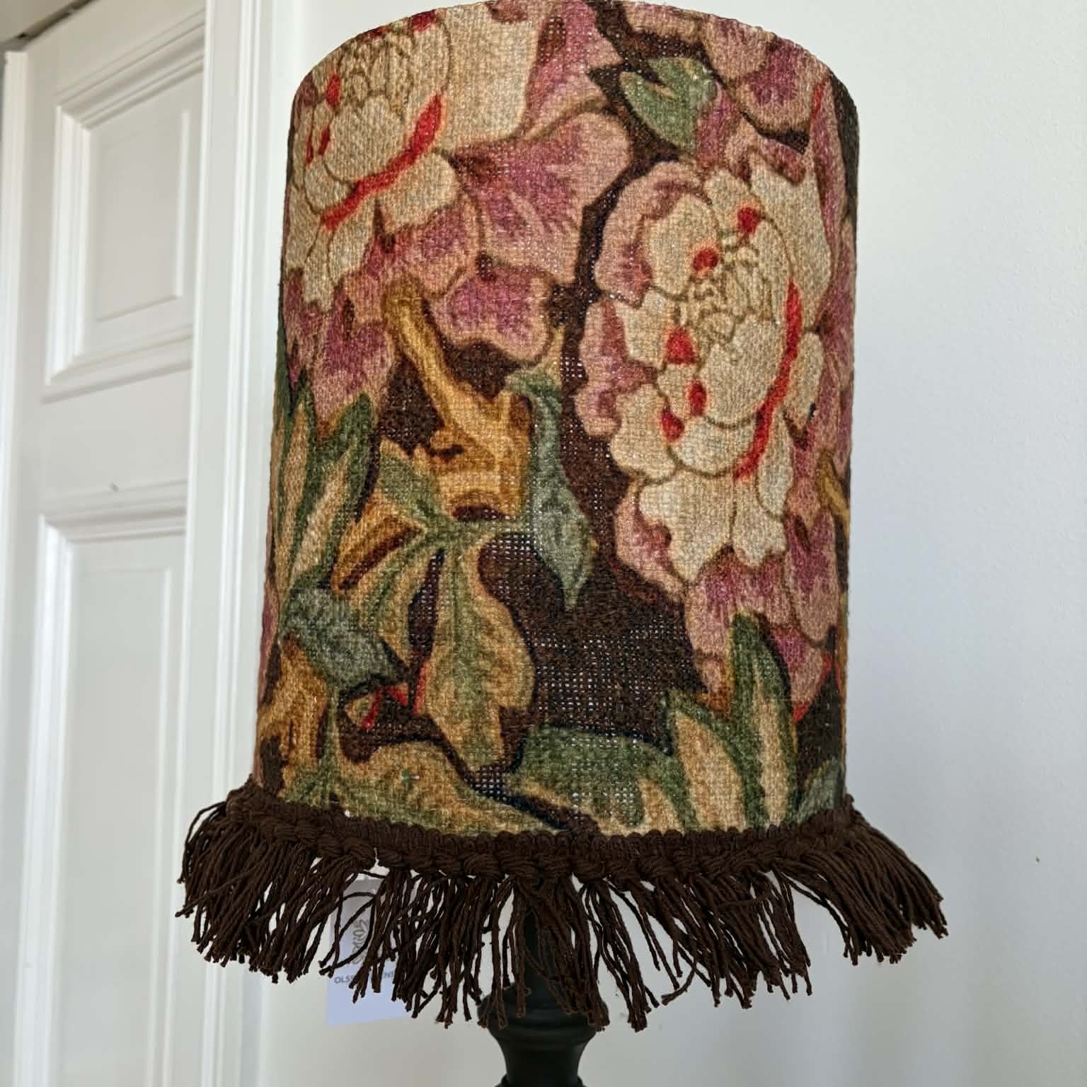 Vacker och dekorativ lampskärm med blommönster i romantisk och klassisk stil. Den detaljrika textilen med mjuka toner av beige, rosa, grönt och brunt tillsammans med dekorativa fransar nertill ger ett varmt och ombonat uttryck.