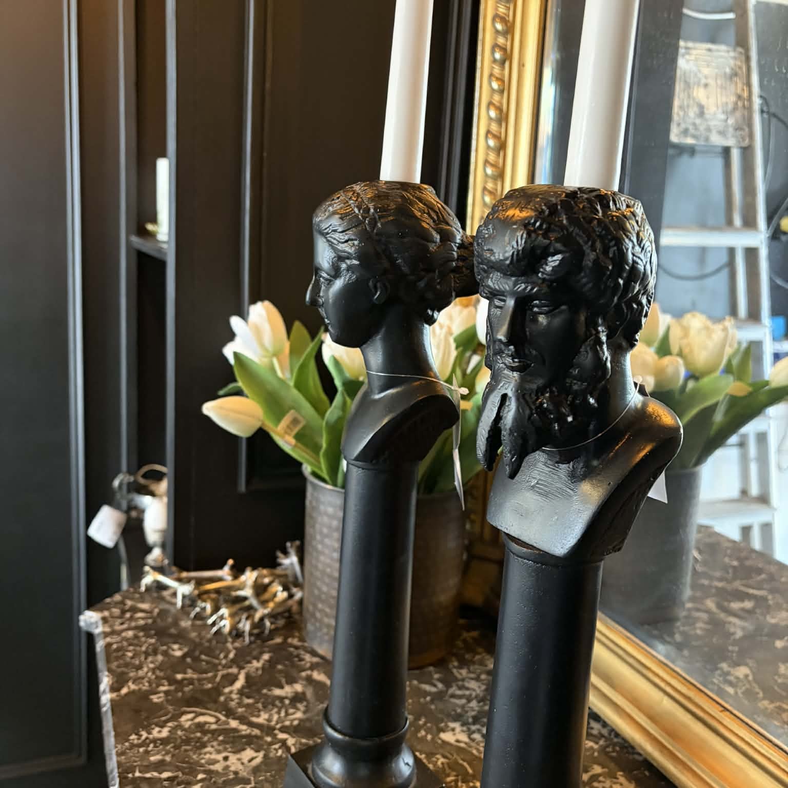 Elegant och dekorativ ljusstake i svart finish med skulptural figur som ger ett stilfullt och uttrycksfullt intryck i hemmet. Den unika designen kombinerar klassiska former med ett modernt uttryck och blir en vacker detalj i både klassisk och modern inredning.