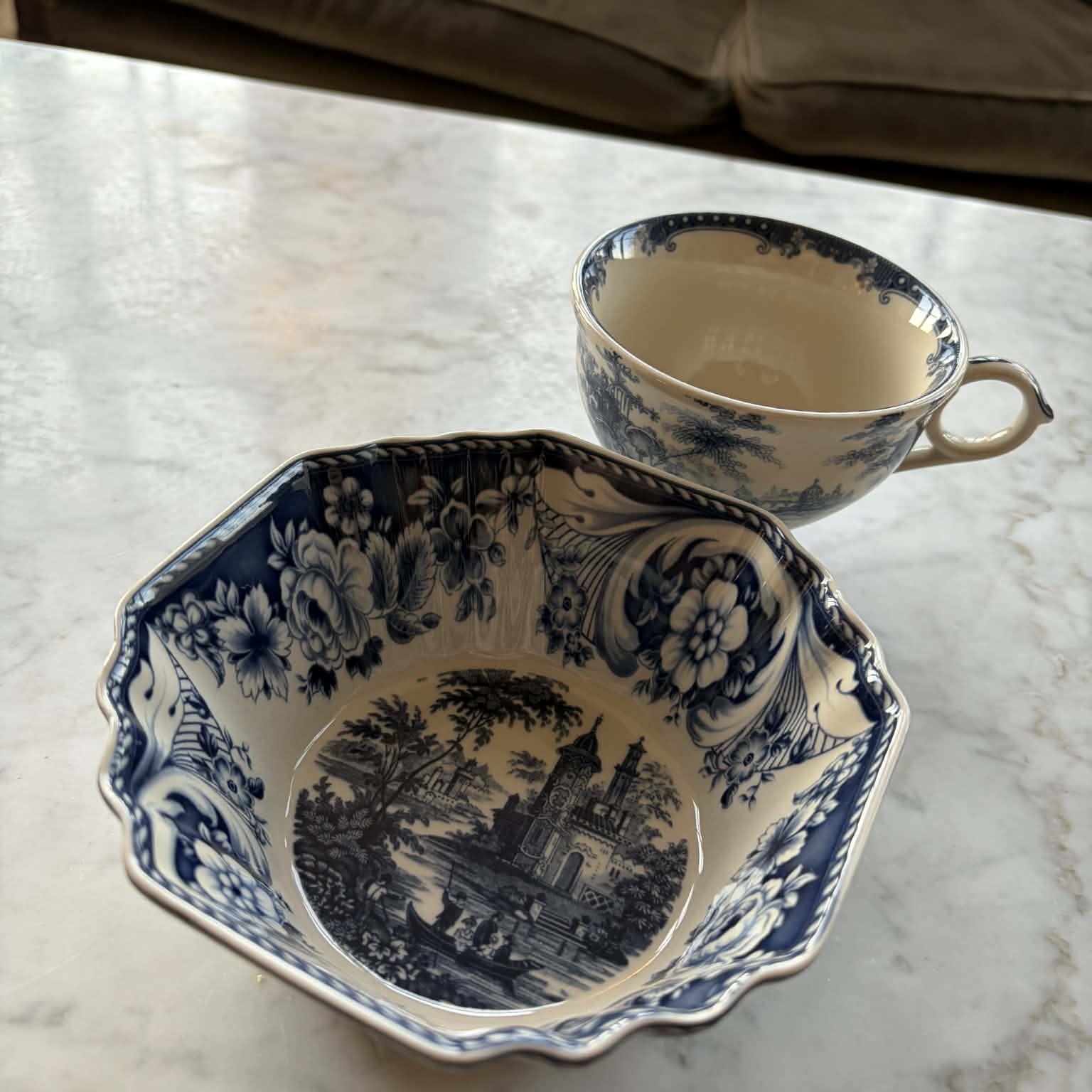 Elegant serveringsskål i porslin med klassisk dekor och dekorativt landskapsmotiv. Finns i tre olika färger: svart, röd och blå, vilket gör den lätt att kombinera med övriga delar i serien eller använda som ett vackert blickfång på egen hand.