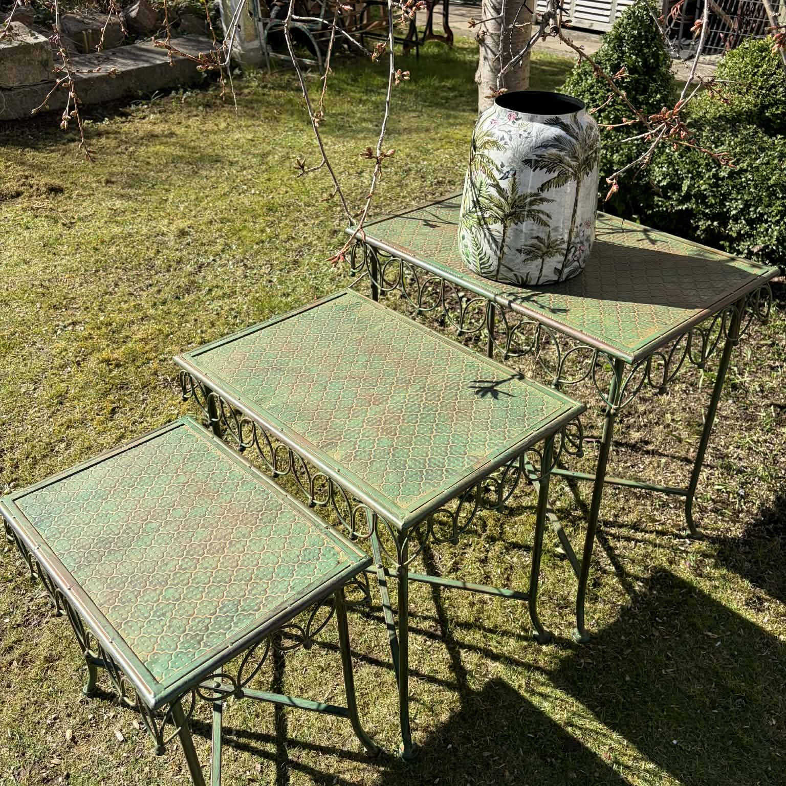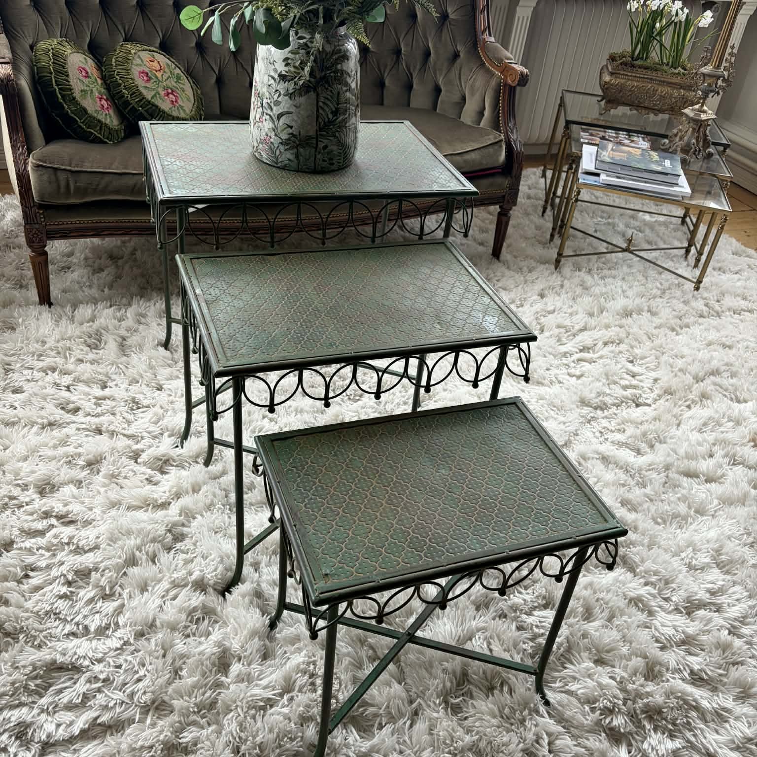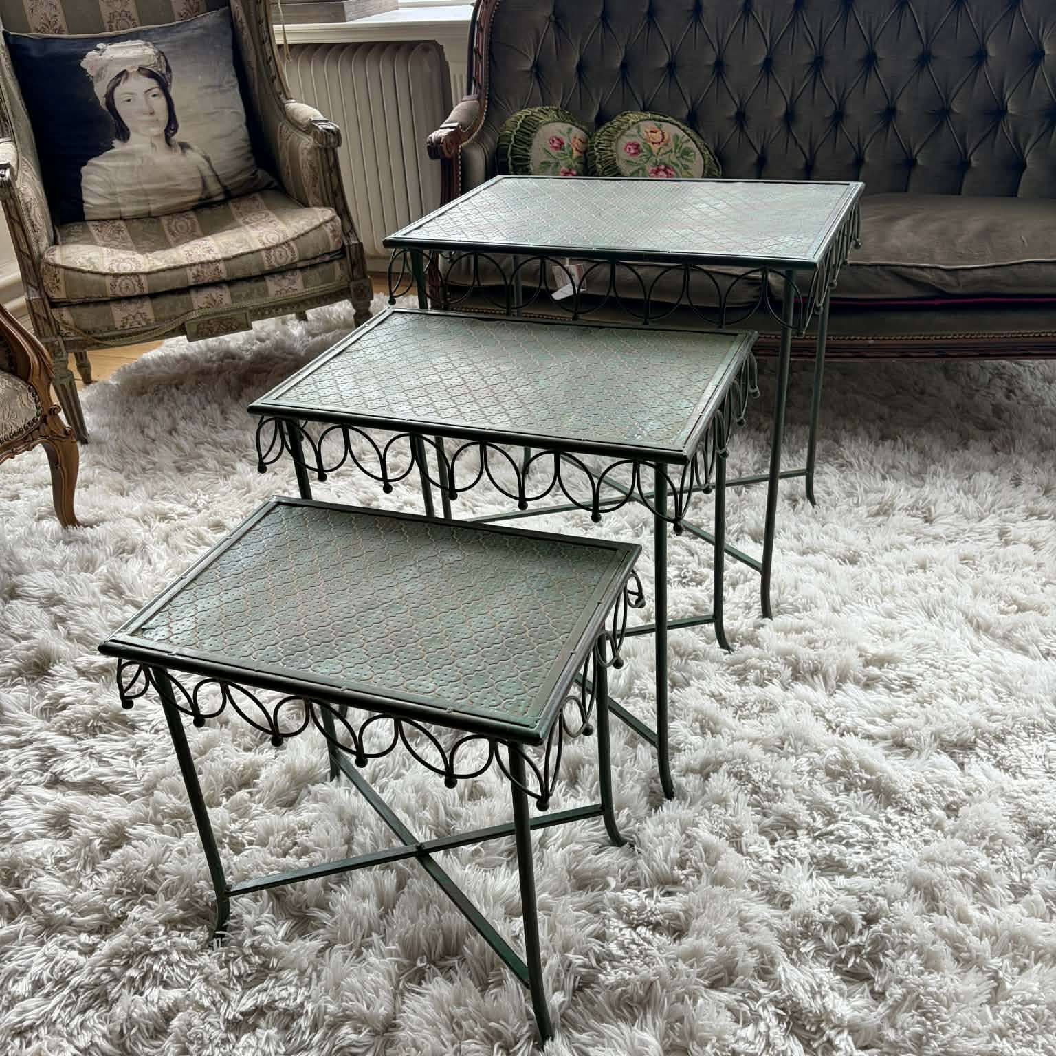 stilfullt sidobord i grön metall med vackert mönstrad bordsskiva och detaljrik underdel som ger ett elegant och klassiskt uttryck. Borden finns i olika storlekar och passar lika fint att använda var för sig som tillsammans för en levande och dekorativ helhet.