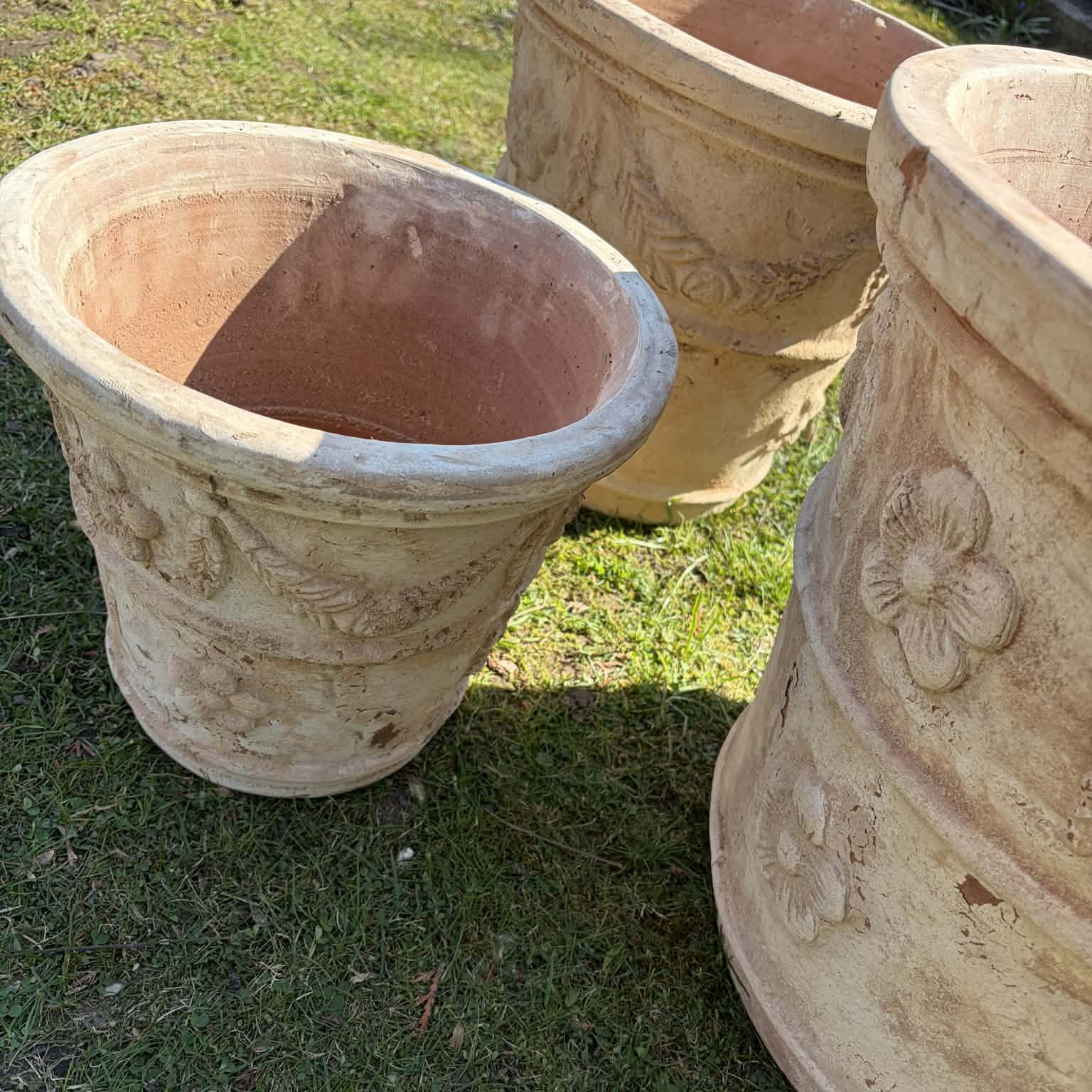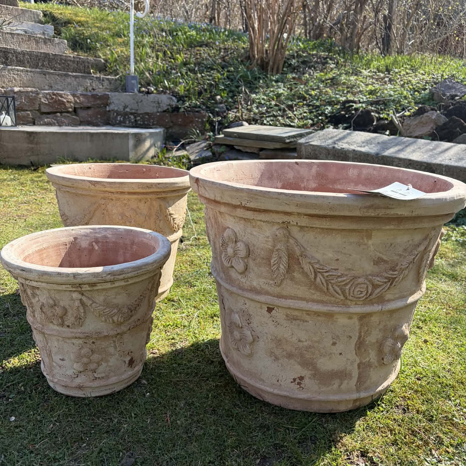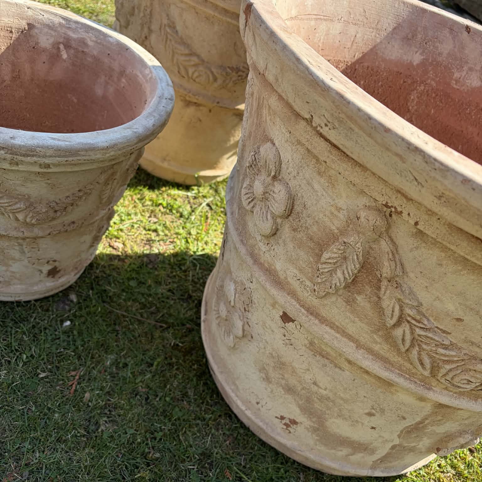 Dekorativa terracottakrukor i tre olika storlekar med vackert reliefmönster av blommor och girlander. Klassiska och tidlösa krukor som passar lika fint på terrass, i orangeri, växthus eller som stilfull detalj inomhus.