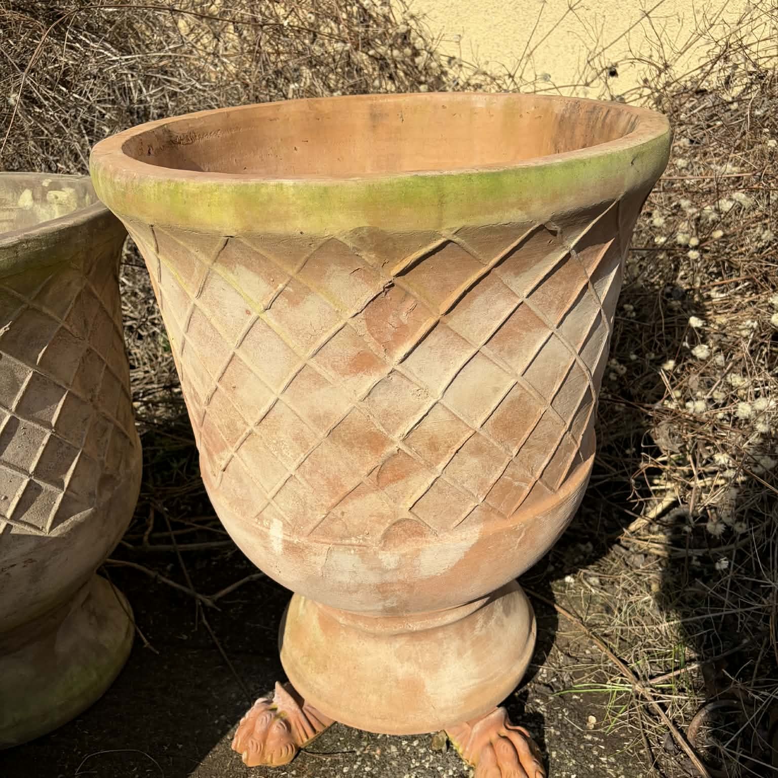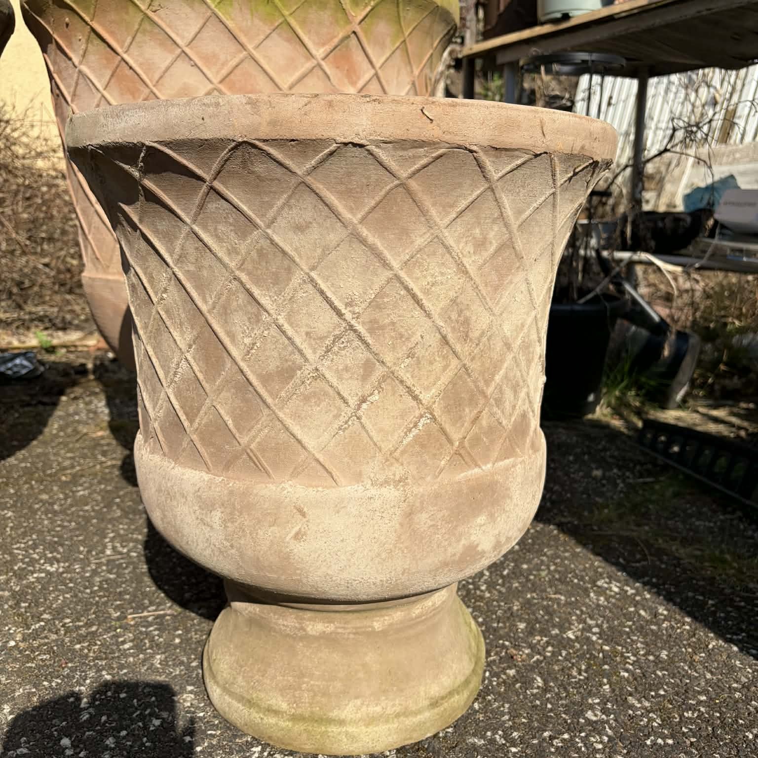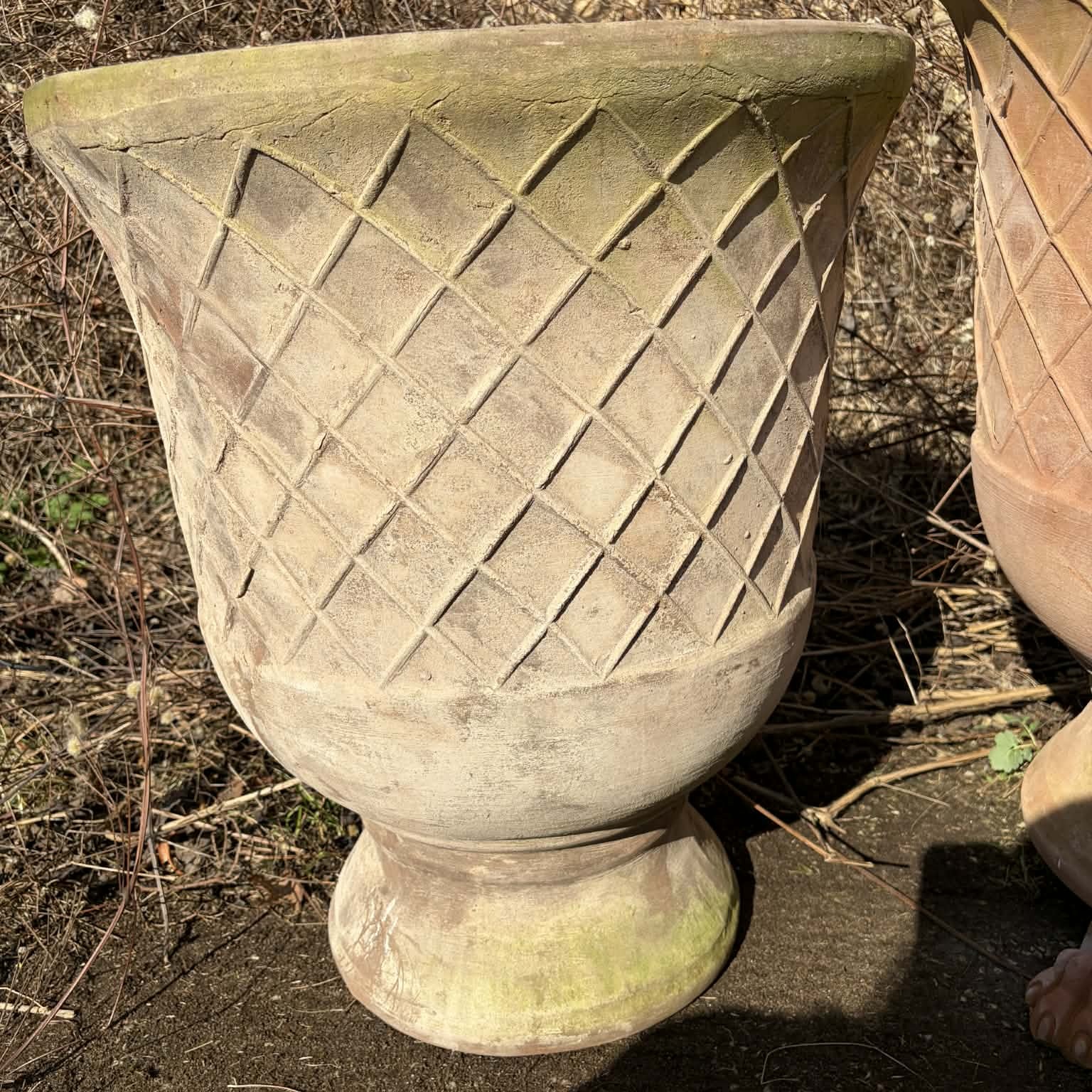 Terracottakrukor i två olika storlekar med vackert rutmönster och klassisk, tidlös form. Krukorna passar lika fint i trädgård, på terrass, vid entré eller i orangeri och ger ett stilfullt, rustikt uttryck.
