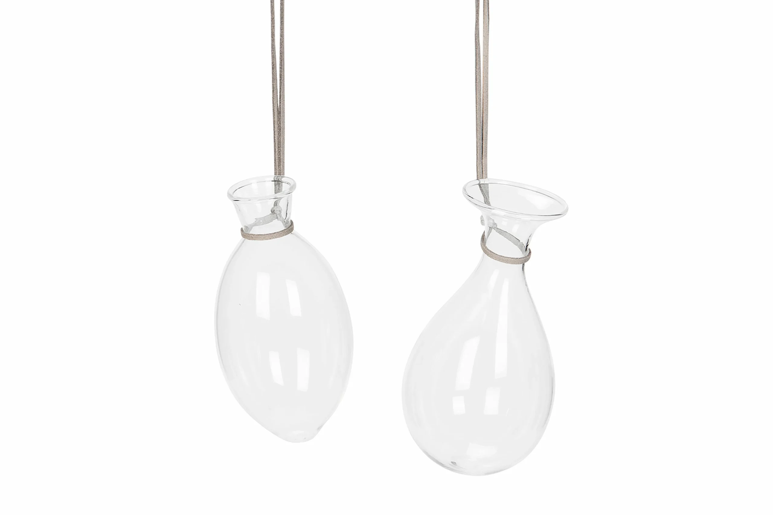 Set med två små, hängande vaser. Vackra att sätta små snittblommor i och hänga i fönstret. Tillverkade i glas.