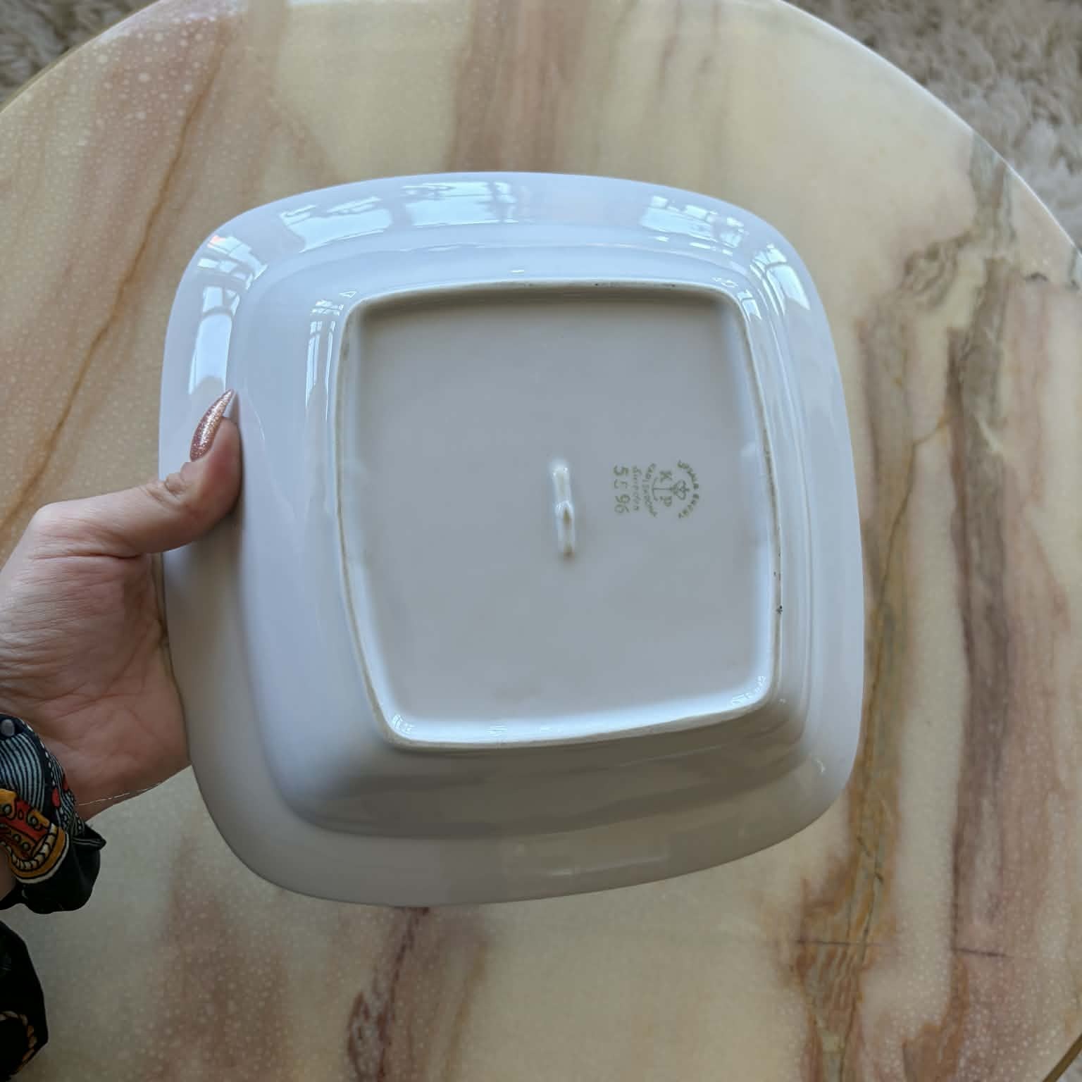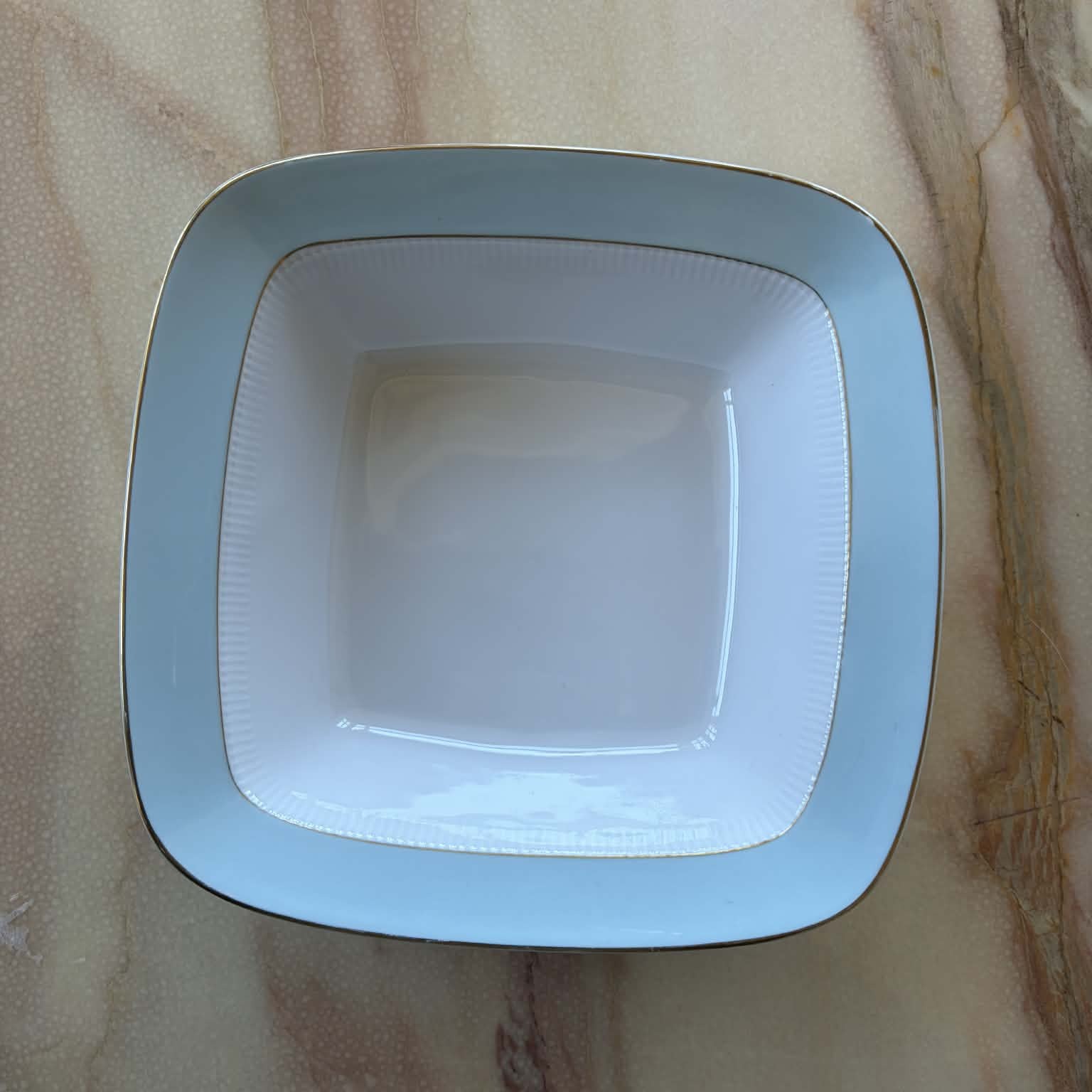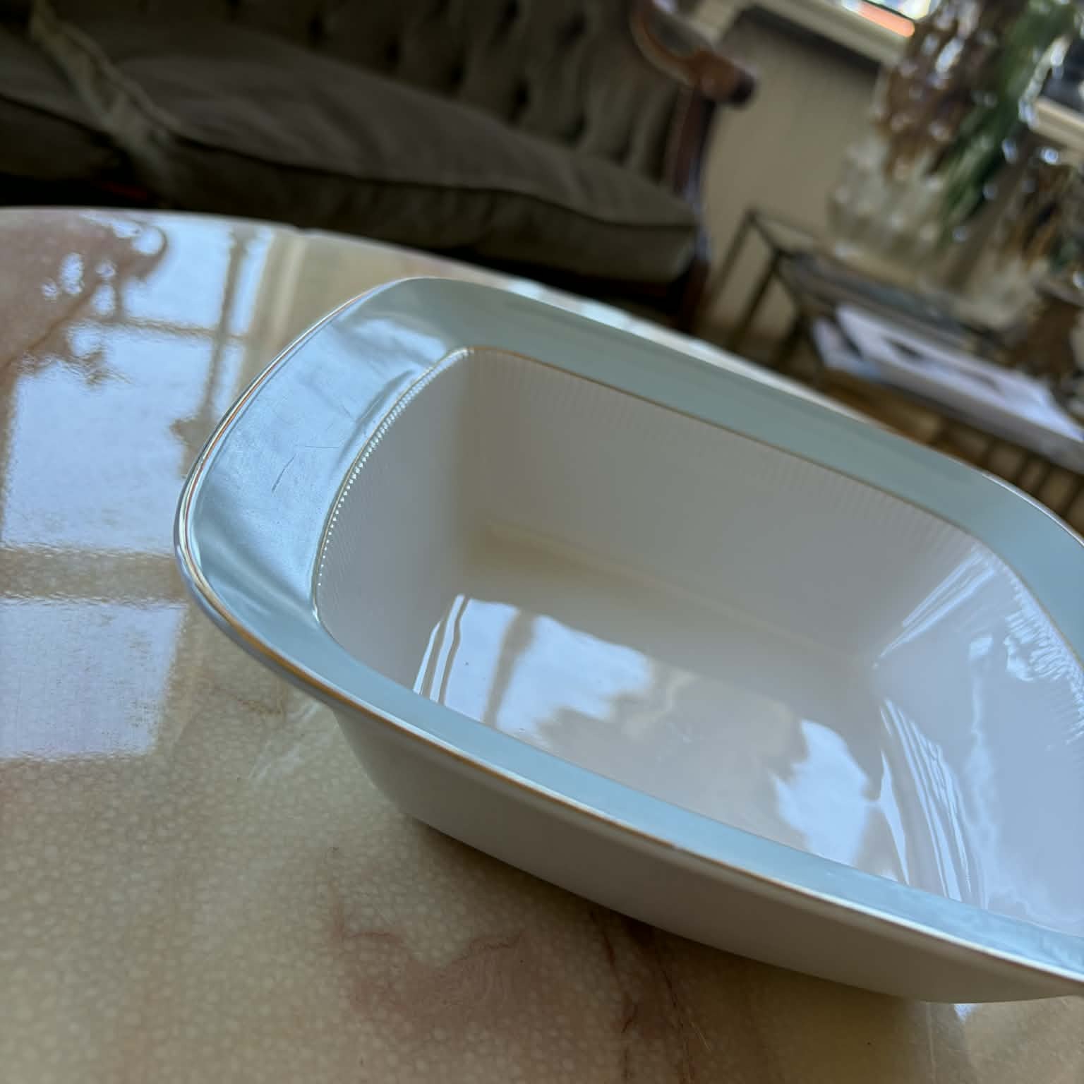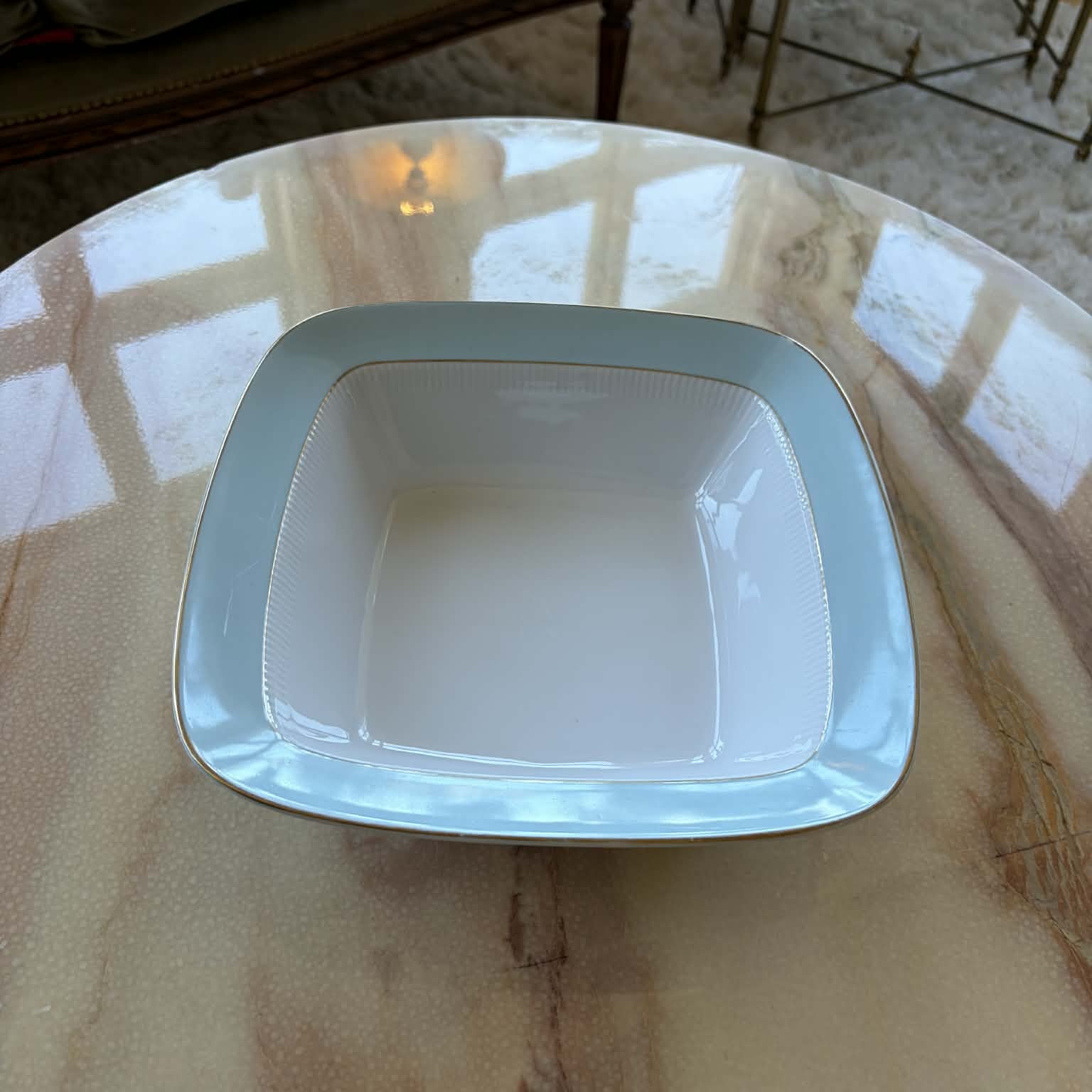 Elegant serveringsskål i vitt porslin med mjukt kvadratisk form, rundade hörn och fin guldkant. En stilren och tidlös skål som passar lika fint till servering som till dukning på ett vackert bord.